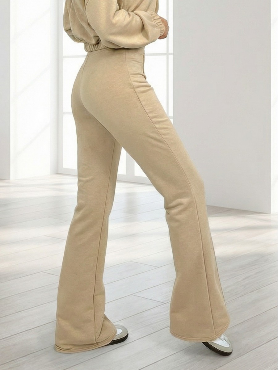 La taille haute et la ceinture élastique assurent un maintien parfait, tandis que les jambes évasées allongent visuellement la silhouette.