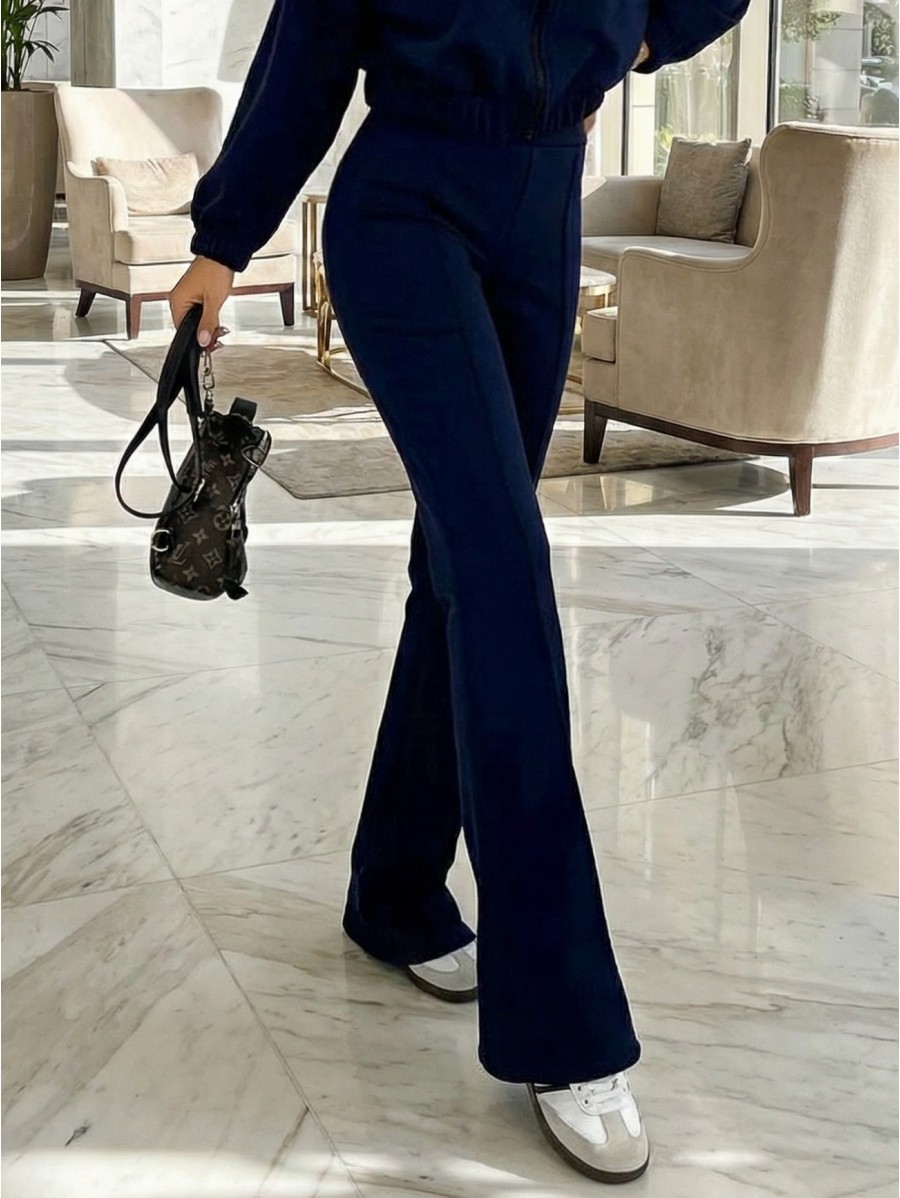 La taille haute et la ceinture élastique assurent un maintien parfait, tandis que les jambes évasées allongent visuellement la silhouette.