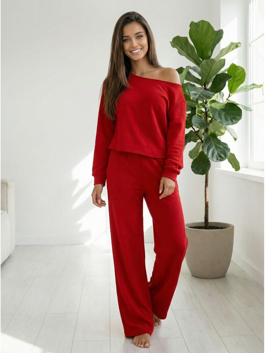 Le haut ample à épaule dégagée et le pantalon à taille ajustable créent un look féminin et élégant, parfait pour les journées fraîches à la maison ou pour une promenade.