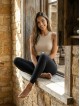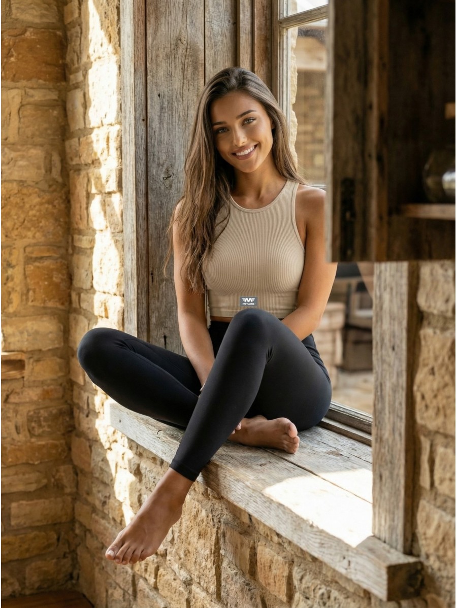 Un haut à bretelles en matière côtelée élastique assure un ajustement parfait et met en valeur la silhouette féminine.